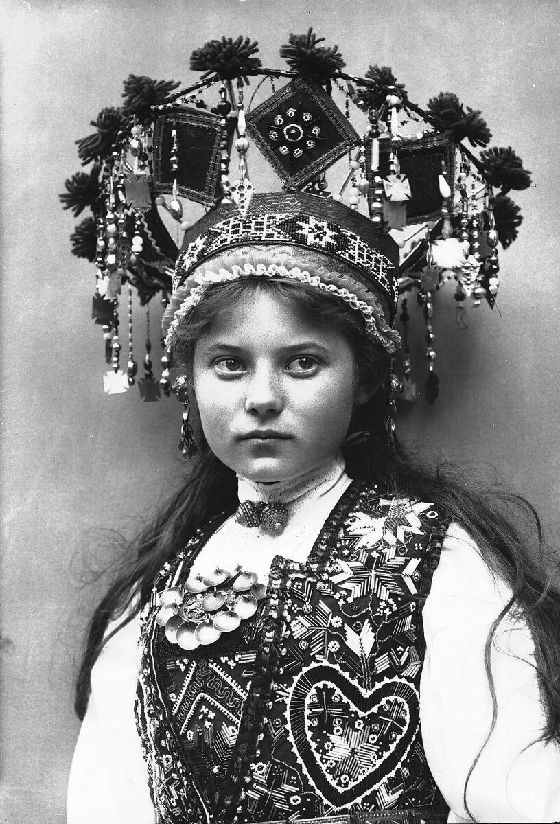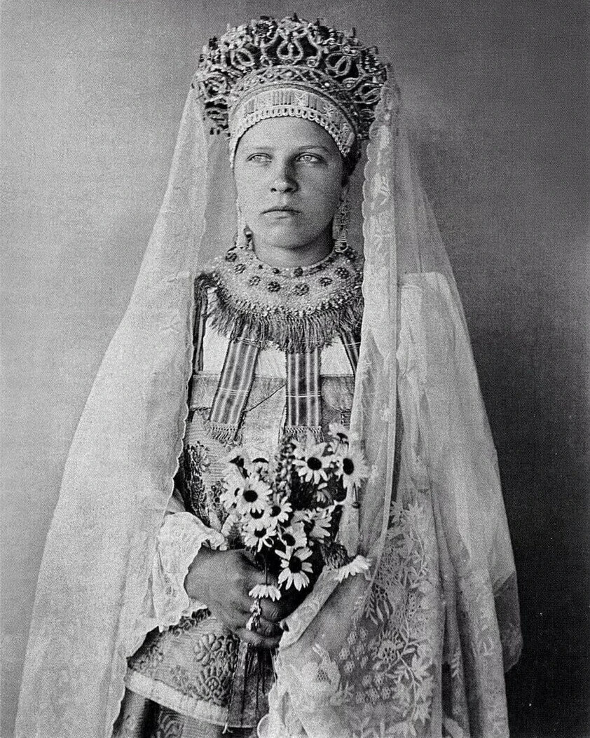 А это уже русская невеста. Вы же наверняка ждали, правда? На фотографии ниже крестьянка из Олонецкой губернии в свадебном головном уборе под названием "корун" и с букетом свежих ромашек в руке. Вторая половина XIX века.