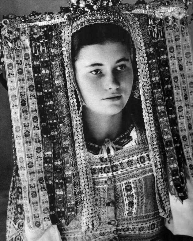 Начнем с болгарских жениха и невесты. Это фото сделано в 1893 году. Как и на многих следующих снимках, в первую очередь обращаешь внимание на очень объемный головной убор невесты. В Болгарии сложные композиции из шерстяных кос и букетов цветов закреплялись между собственными волосами невесты, которые были заплетены в дюжину или более кос.