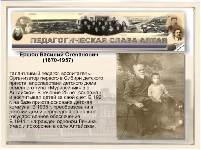 Похоронили его на кладбище в селе Алтайском. А «Муравейник» существует до сих пор, правда, называется он теперь «Алтайский центр помощи детям, оставшимся без попечения родителей, имени В.С. Ершова».