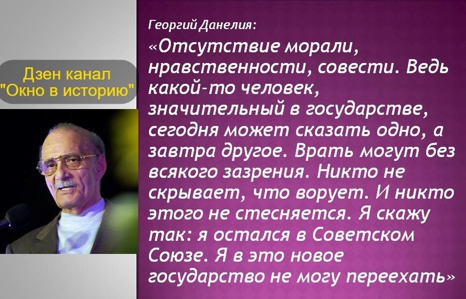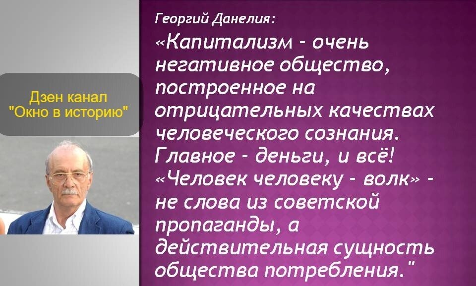 В данной статье я приведу лишь несколько наиболее ёмких и ярких цитат Георгия Данелии, которые поймут все те, кто вкусив жизнь при капитализме, теперь особенно обострённо понимает, какую же Великую и Справедливую для людей страну под названием СССР у нас украли.....