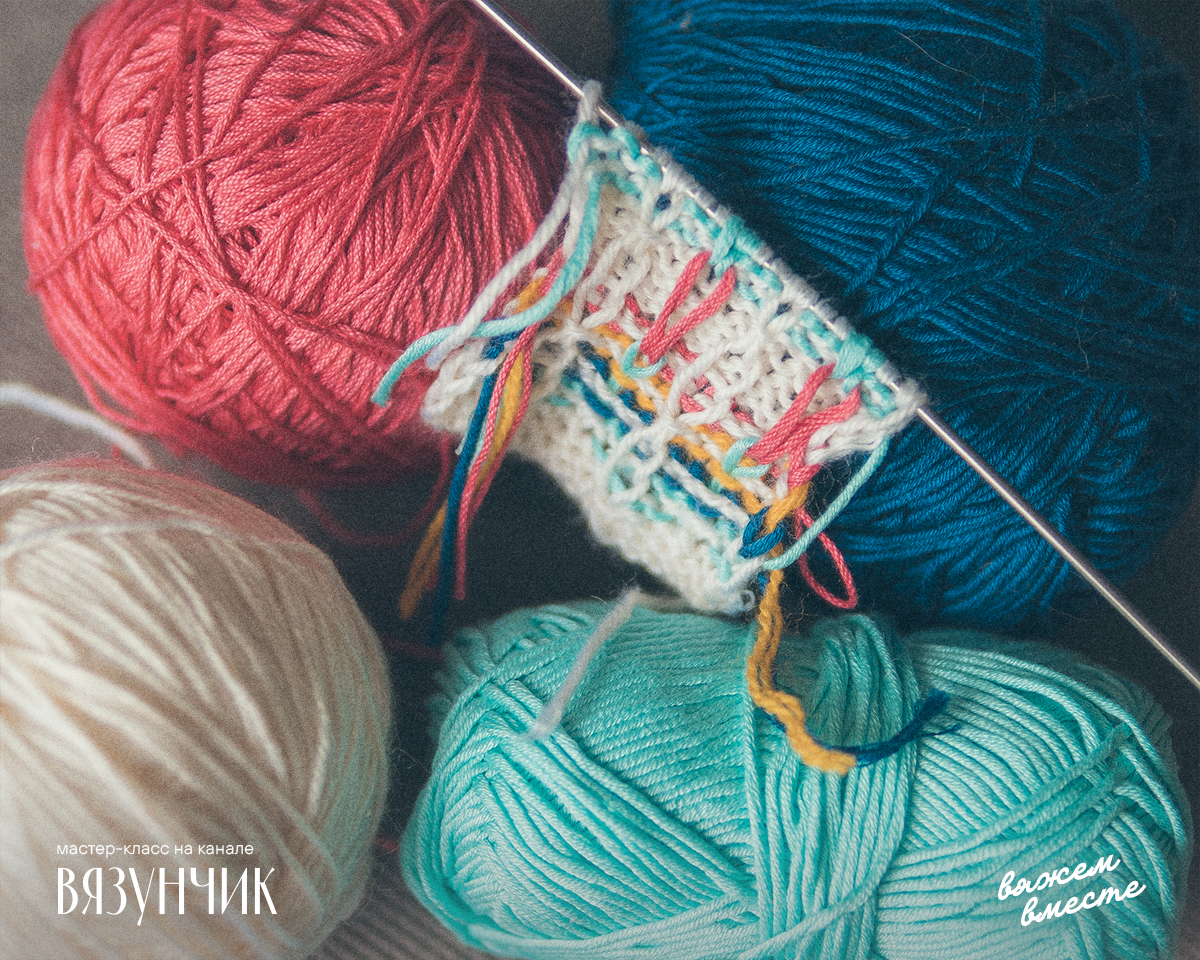 Т. к. смена нити происходит практически всегда каждый ряд, предлагаю не отрывать как минимум основную нить. Для этого вам потребуются спицы без ограничителей, либо круговые. Мы вяжем ряд, переворачиваем полотно, переходим к другой нити, вяжем ещё один ряд, а затем начинаем вязание со стороны основной нити. Т. е. получается, что мы перетягиваем ее через ряд. При желании избежать даже такой микропротяжки можно провязывать первую петлю двумя нитями сразу.