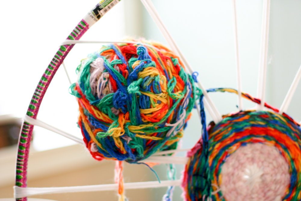 Для того, чтобы начать занятия, нам понадобится уже сделанный Вами станок и 2-3 моточка цветных ниток. Если у Вас таковых нет, то можно распустить пару свитерков, желательно разноцветных (только не маминых, хотя, я думаю, она обрадуется, если вместо пропавшего старого свитера Вы покажете ей новый и красивый гобелен). В крайнем случае их можно купить в магазине.