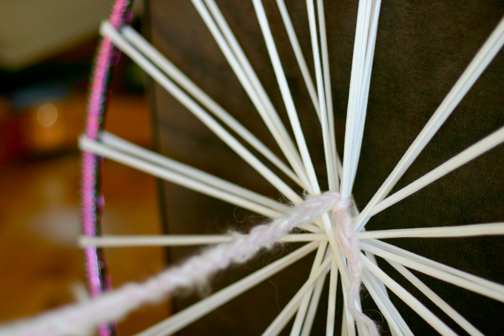 Для этого нужно привязать веревочку за последнюю нить основы и, растягивая его, привязать к Вашей раме Вот таким образом.