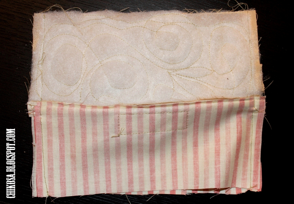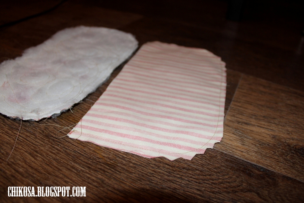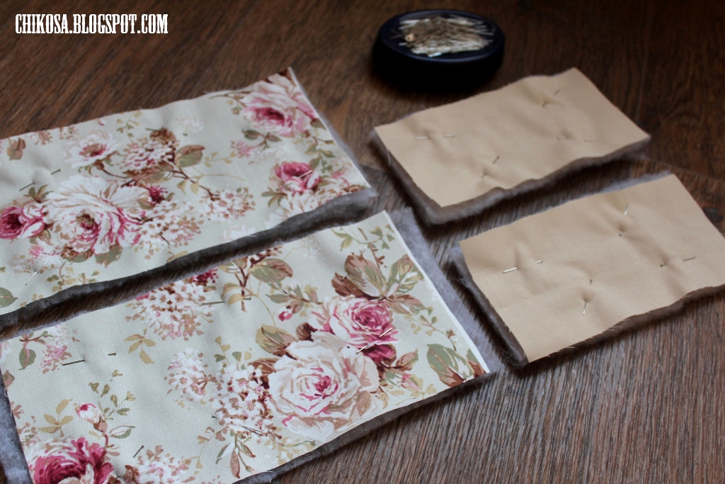 Приколем иголочками тонкий слой синтепона. Для верхней части я отделила более толстый слой, чем для нижней (так как на нижней будет сборка):