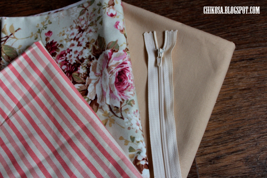 Нам понадобятся ткани трех расцветок, сочетающихся по цветовой гамме, замочек, пуговица, ленточка и тонкий синтепон.