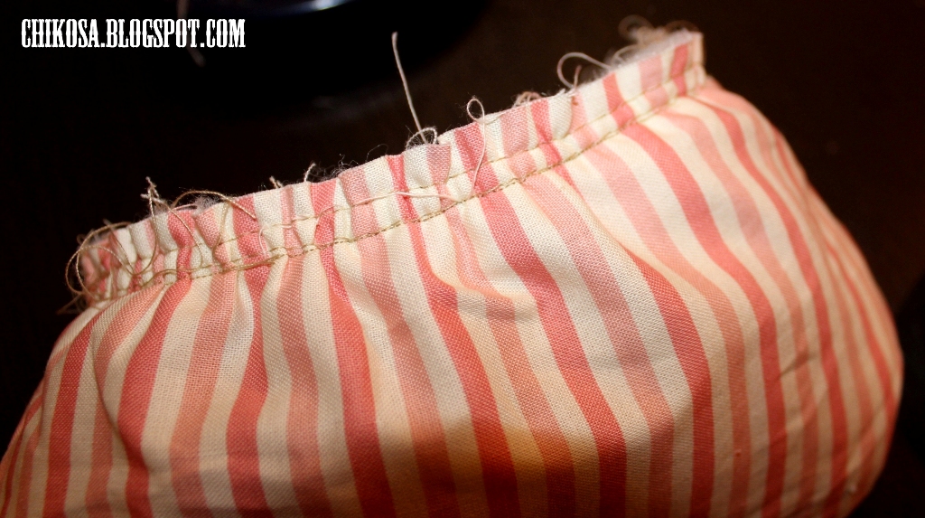 Вставим подклад нижней части в верхний слой нижней части, прошьем по окружности две строчки, длина стежка максимальна (у меня на пятерке). Аккуратно стянем до диаметра окружности нашей сшитой верхней части косметички. Завяжем нити и равномерно распределим складки: