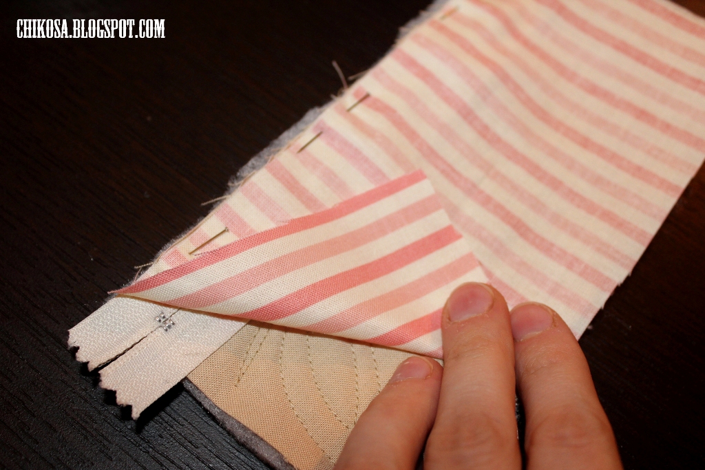 Теперь вшиваем молнию: приколем иголочками, как показано на фото, лицо к лицу, молния между ними. Прошьем, используя обыкновенную лапку для вшивания молнии.