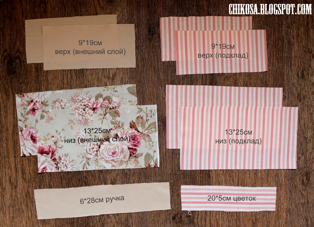 Вырежем такие детали: по две 9 на 19 см для верхней части и две 13 на 25 см для нижней части косметички для верхнего слоя и для подклада. Полоска 6 на 28 см для ручки, полоска 5 на 20 см для цветка.