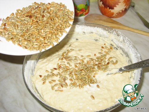 С утра пораньше (я делаю это перед последнем кормлением закваски) зёрна пшеницы и ржи залить водой 130-150 мл., довести до кипения и варить на медленном огне 50 минут, поглядывать чтобы зёрна не пригорели, если понадобится, то добавить чуть-чуть воды. После 50-ти минут добавить 100 мл горячей воды и смесь семян и варить всё ещё 10 минут. Оставить всё это в закрытой кастрюле пока эта масса не остынет.