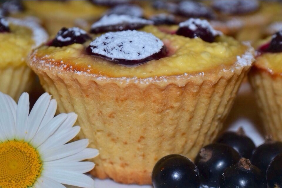 Начинка: творог, яйца, сахар, ванилин и сливки ( сметана) перемешать. Тесто распределить по формочкам, сделав бортики. Выложить начинку. Сверху положить черешню без косточек и черную смородину, посыпать коричневым сахаром ( я не посыпала ). Выпекать 20 - 25 мин. при температуре 200 градусов. Охладить в формочках, затем вынуть.