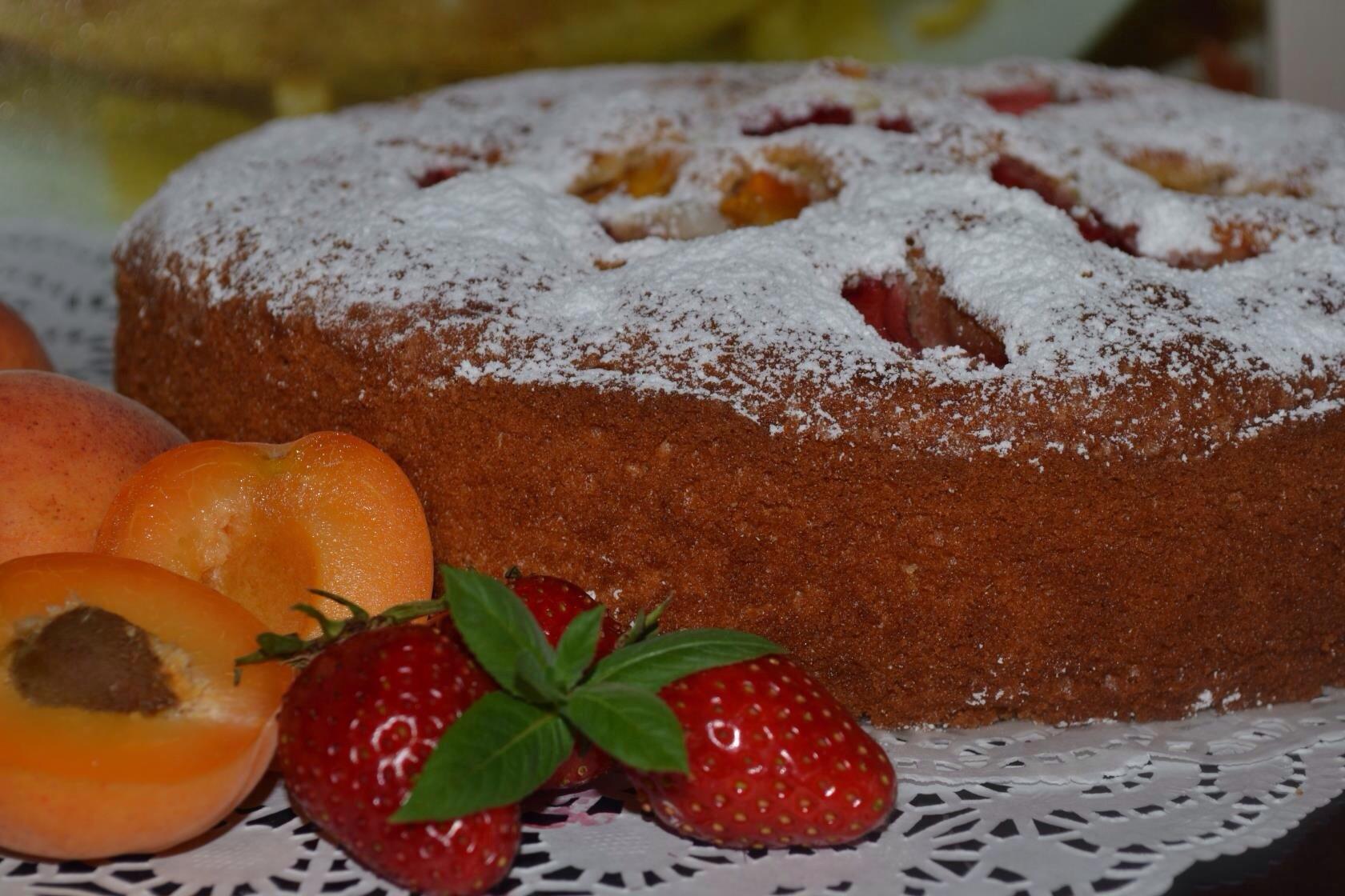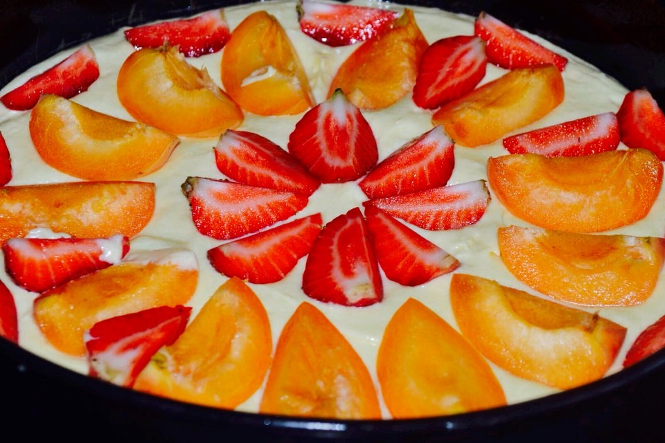 Берём 160 грамм мягкого сливочного масла + 200 грамм сахара + 1 пакетик ванильного сахара, взбиваем, добавляем 2 крупных яйца + 250 мл молока (у меня 100 мл сливок и 150 мл молока) и еще взбиваем до однородности. Отдельно смешиваем 320 грамм просеянной муки + 1 пакетик разрыхлителя (10 гр) + щепотку соли и добавляем в молочную массу. Вымешиваем хорошо. Тесто выливаем в разъемную форму (на низ пергамент), сверху выкладываем половинки абрикосов срезом вверх (я еще добавила клубники) и посыпаем коричневым сахаром ( можно и простым). Диаметр формы у меня 24 см. Выпекаем при 190 градусах 40 - 50 минут до сухой лучинки. Даем пирогу полностью остыть.
