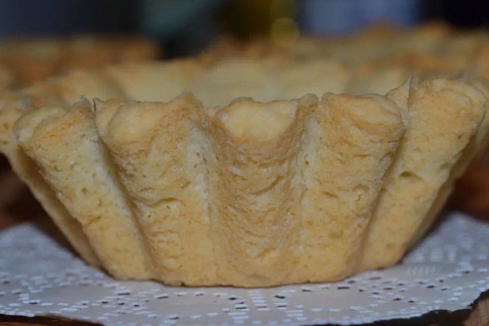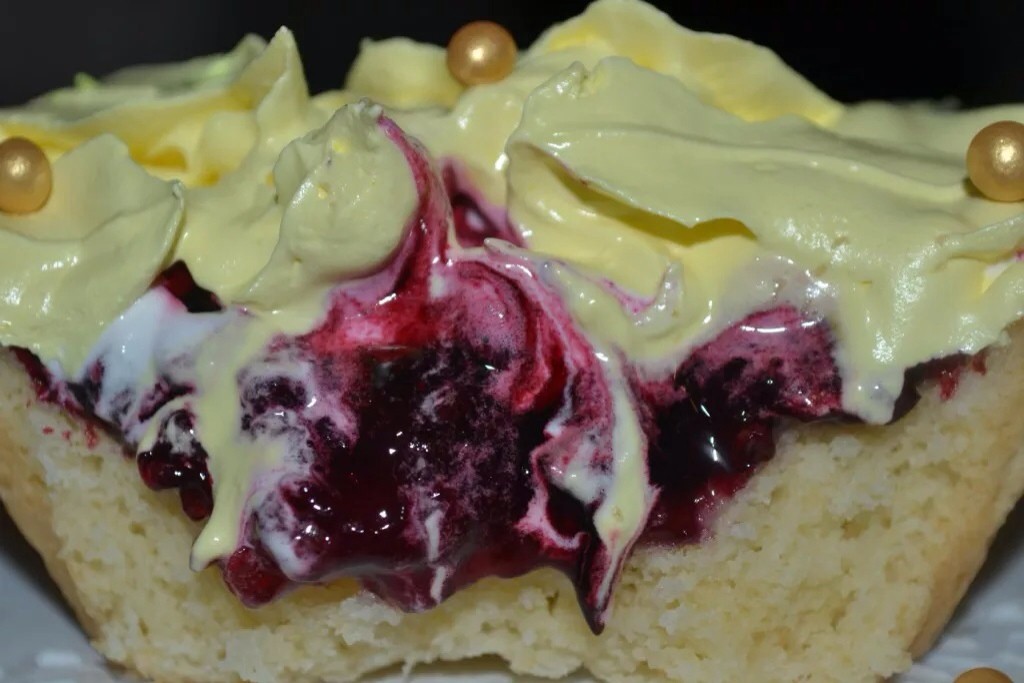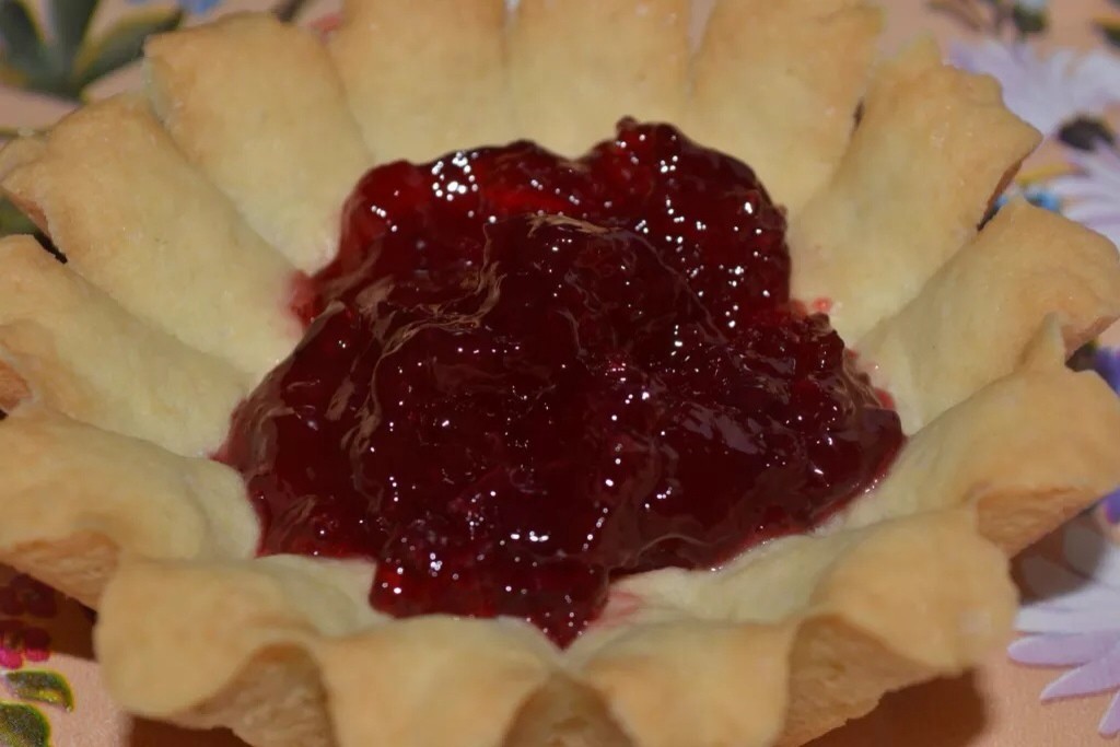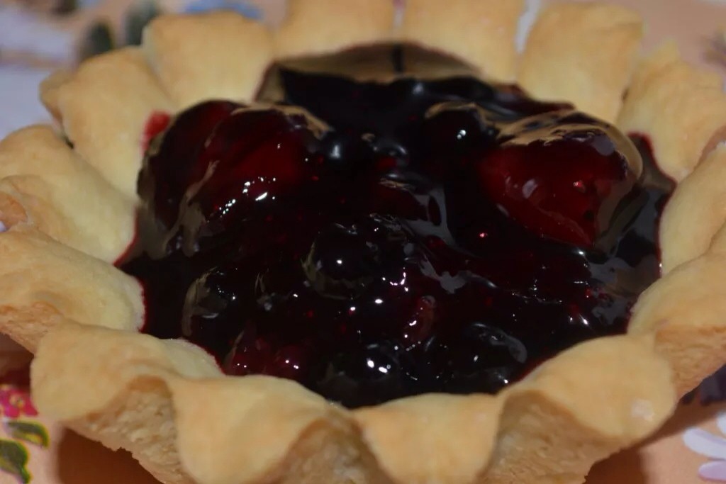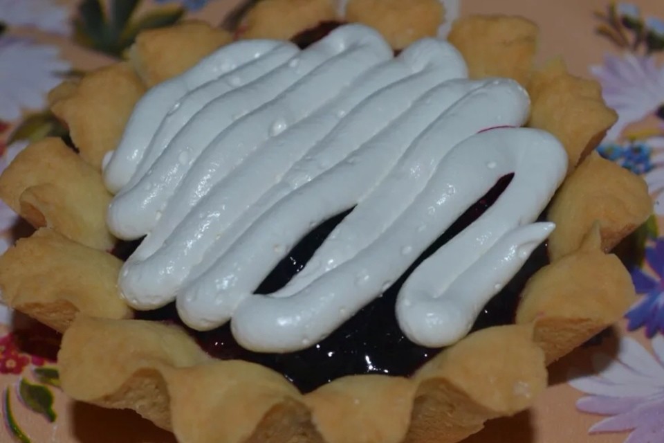 Для песочных корзиночек берем 150 гр мягкого сливочного масла + 100 гр сахара и взбиваем венчиком. Добавляем 1 яйцо + 1 ст л майонеза + 2 стакана просеянной муки смешанной с разрыхлителем ( 5 гр). Замешиваем быстро мягкое, эластичное тесто и убираем его в холод на 20 минут. Наполняем тестом формы, низ корзиночки потыкать вилочкой. Выпекаем корзиночки при 200 градусах до легкого румянца, даем им полностью остыть. На дно корзиночки выложила вишневый джем. На вишневый джем выложила вишню и чернику, проваренную с сахаром, для загустения добавила 1 ч.ложку крахмала, прогрела несколько секунд, сняла с огня, остудила. Верх покрыла белковым заварным кремом.