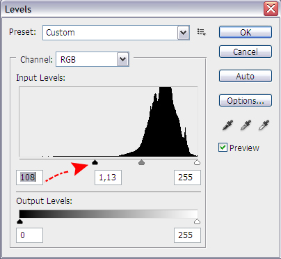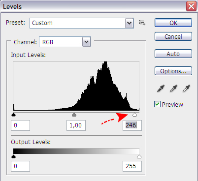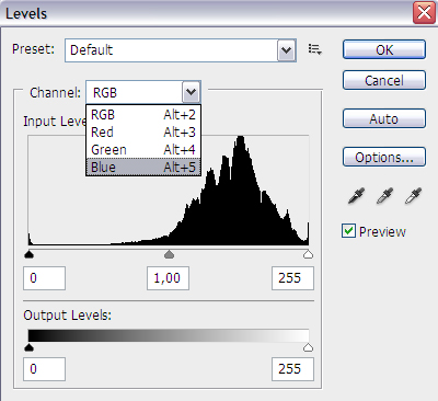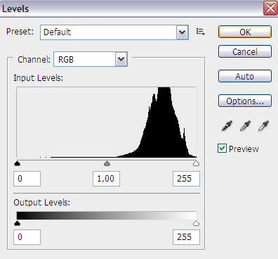 Теперь добавим контрастности нашему фото, осветлим или затемним его. Я для этого пользуюсь Кривыми(Curves). Кривые - это мощный и гибкий инструмент, как с ними работать в двух словах не расскажешь, если Вы хотите научиться этому, вот ссылочка на неплохую статью, где даны основы работы с ними. А сейчас мы поработаем с инструментом попроще - Уровнями (Levels).