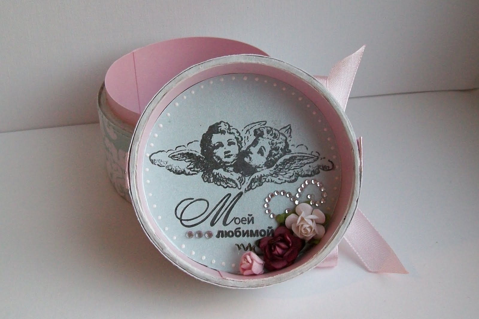 Внутреннюю часть крышки можно украсить и написать пожелание. Я ограничилась штампом Ангелы и надписьюцветочками и завитками из страз: