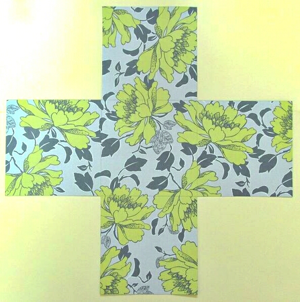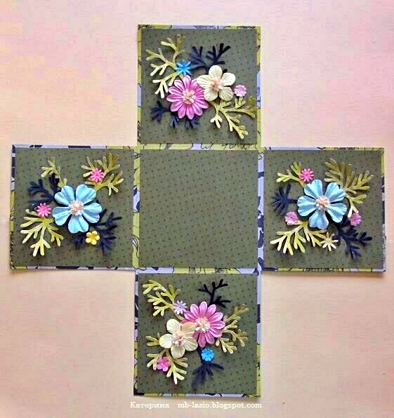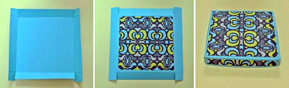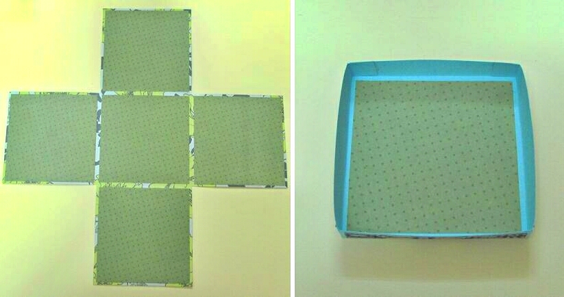 Далее, я вырезала крышечку нашей коробочки, добавив по периметру по 1,5 см для боковых сторон. Потом надрезала их, как показано на фото, обклеила подходящей дизайнерской бумагой и склеила боковушки:
