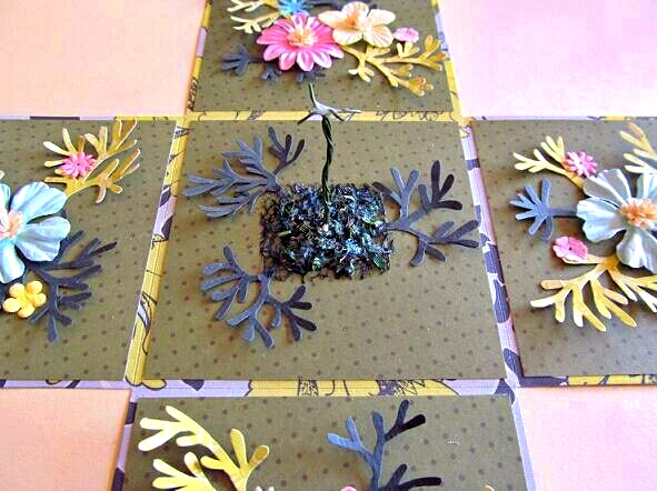 Далее, я вырезала веточки разной формы и разного размера из двух видов подходящей по цвету бумаги. Приклеила их вместе с цветами на боковые части коробочки: