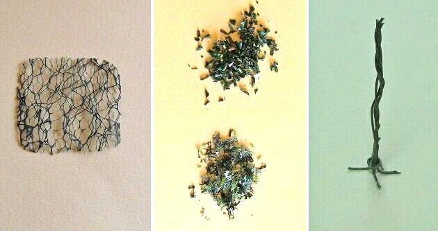 После этого приступила к украшению серединки. Покрасила декоративную сеточку, отрезала квадратный кусочек, а остальное измельчила. Также, измельчила акриловую краску разных оттенков (и такое имеется в моих запасах). Потом из 4 кусочков зеленой проволоки я сделала основу для будущего большого цветка.