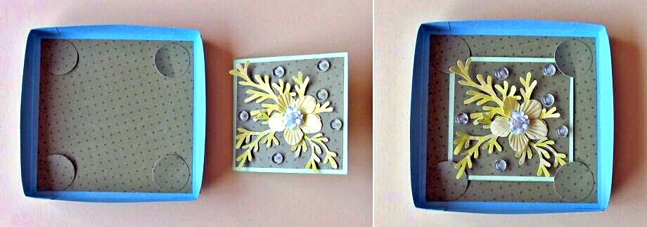 Я сделала очень простую открыточку в стиле самой коробочки. И разместила ее на крышке коробочки. Крепеж - 4 круга, частично приклеенные к крышке. Прочно держится, кстати.