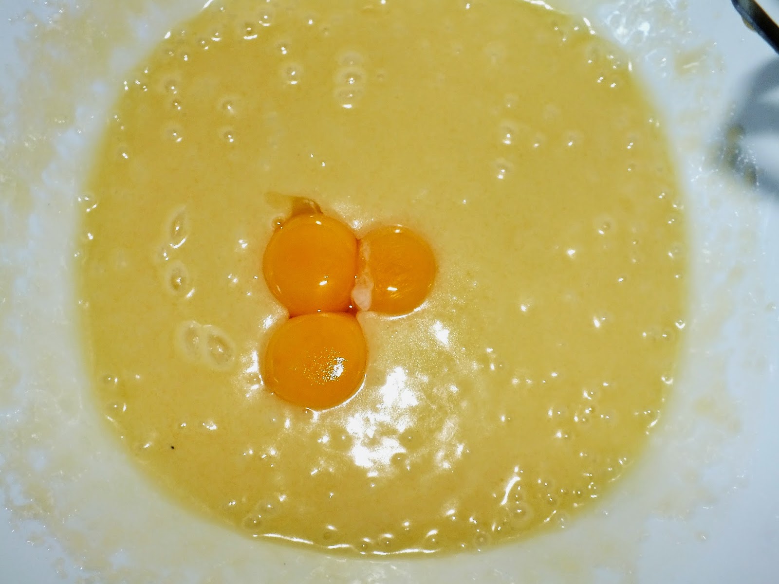 - Яйца разделить на белок и желток. Белок взбить до белой устойчивой пены