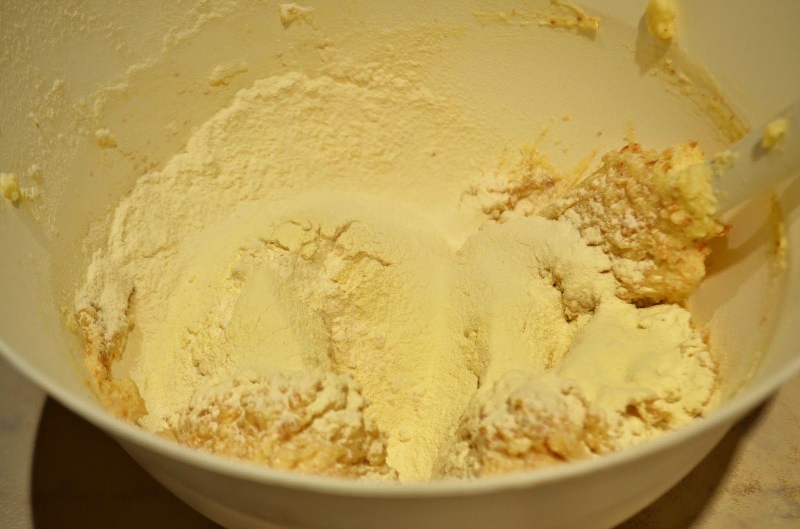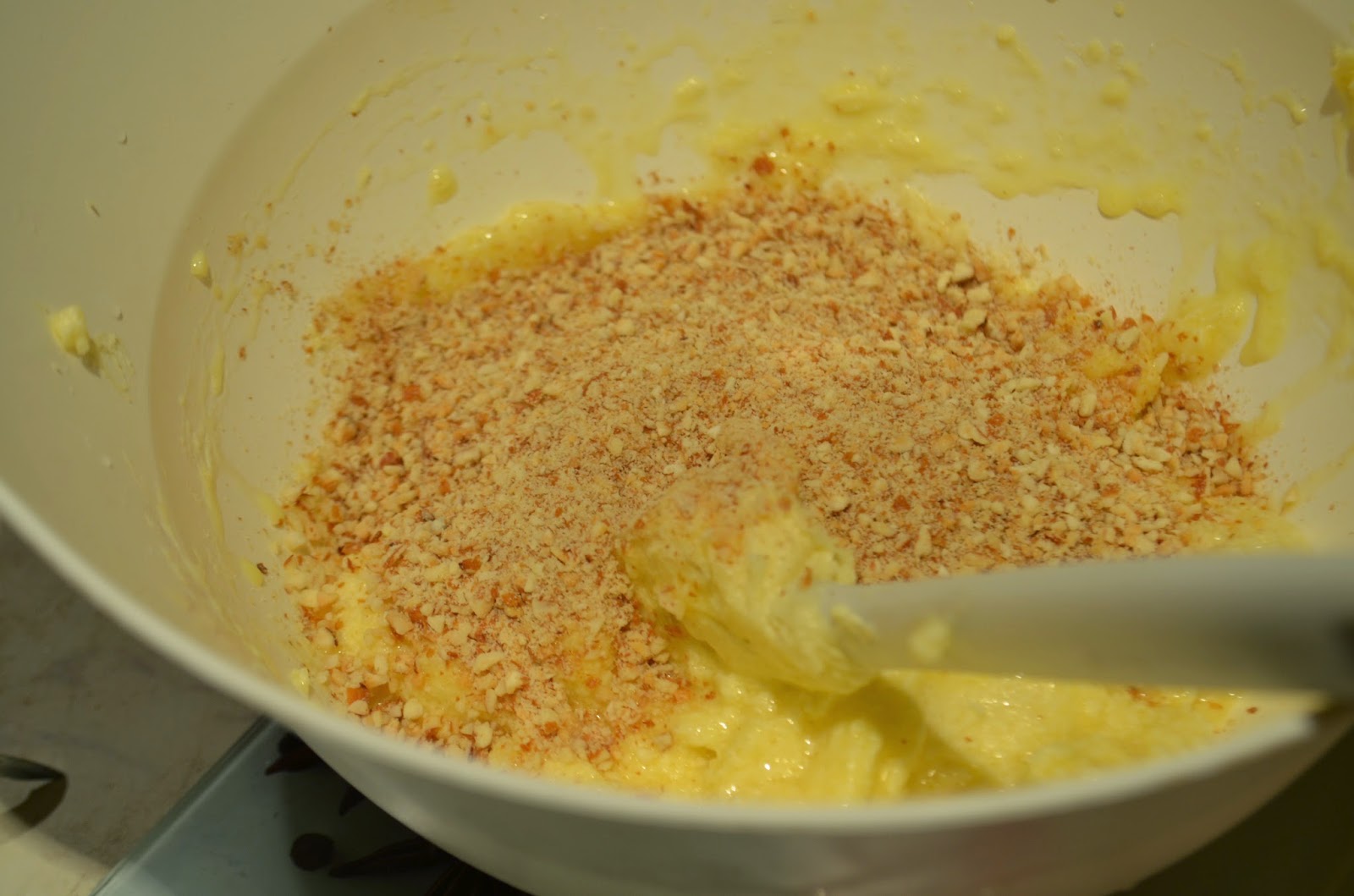 4. Добавить муку, орехи, 1,5 чл разрыхлителя и миндальный экстракт (если он конечно есть)