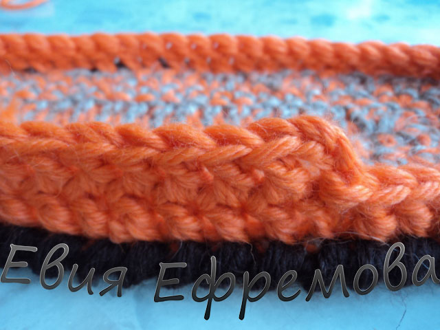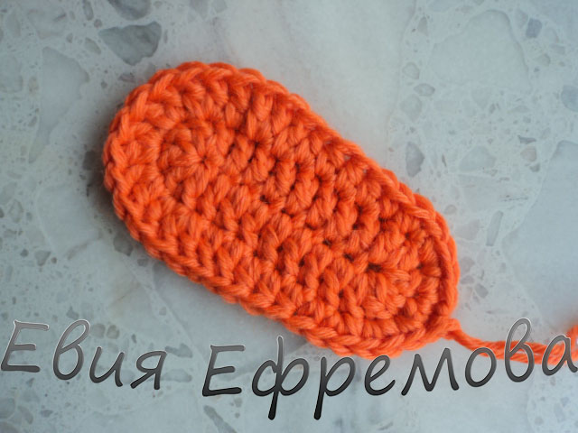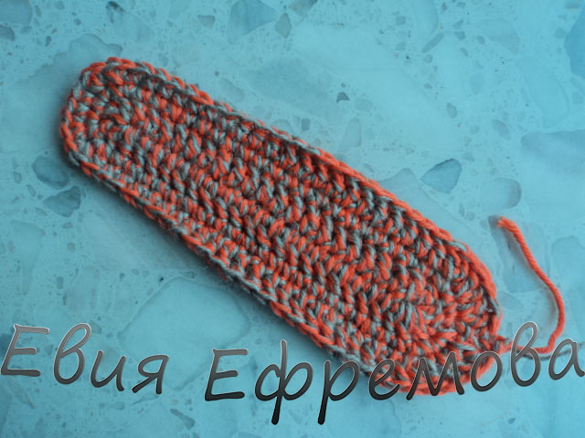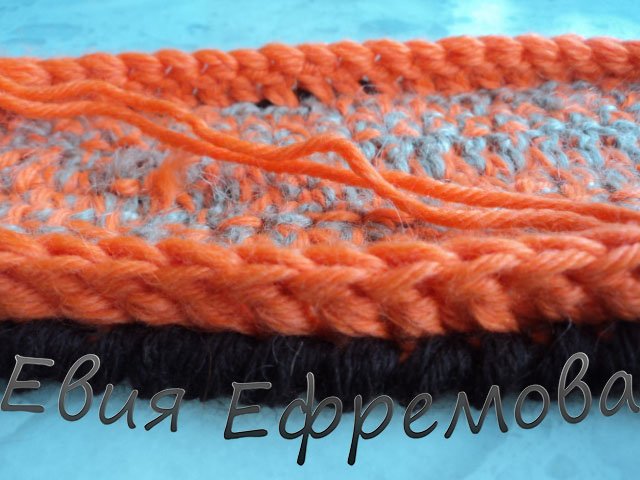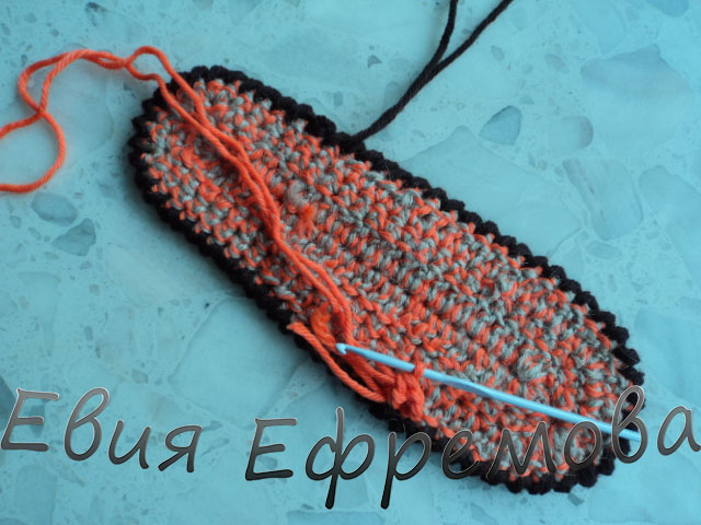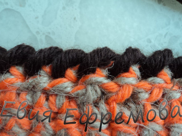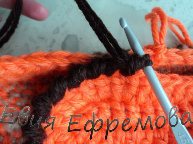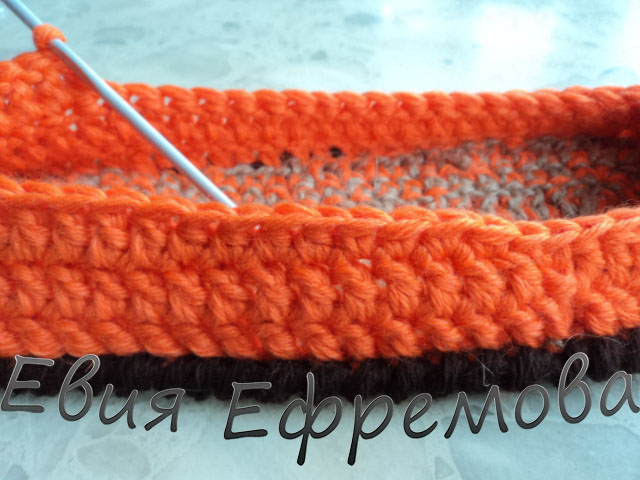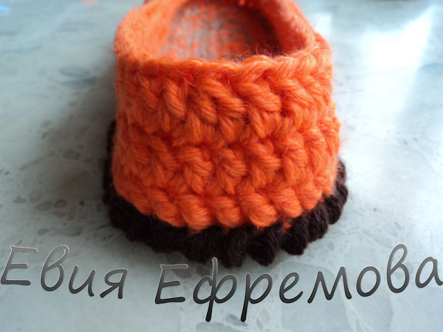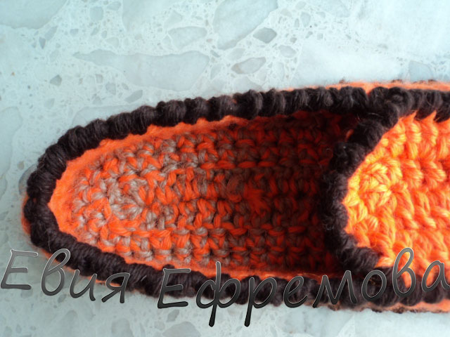коричневые ниточки. Отступив от мысочка 7-8 см, оранжевыми нитками в 2 сложения