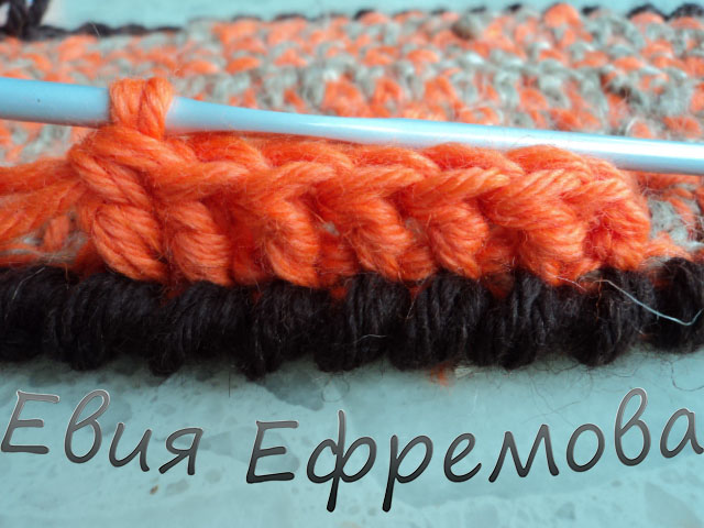 6. Третий ряд начинаем там, где закончился второй. На фото показан плавный переход в третьем ряду со столбика в незаконченный столбик, и затем в столбик с накидом. Ряд постепенно идет на повышение.