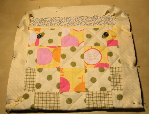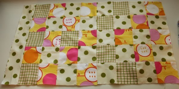 Итак, я нарезала 40 квадратов и сшила их в панель (все делала наугад). К тому же у меня осталась полоска в горошек примерно 6 см шириной, я ее еще сверху пристрочила. Получилась панель размером 55*32 см.