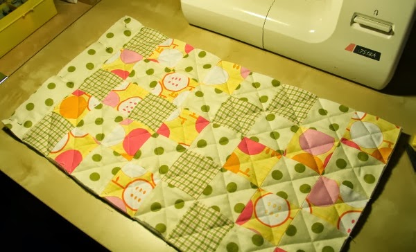 Затем простегала квадраты по диагонали с синтепоном и нижней тканью. На всякий случай, я беру нижнюю ткань и синтепон чуть шире размером, потом просто все лишнее обрезаю.