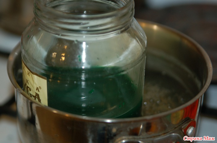 Еще добавила одну старую обгоревшую свечку, которая уже потеряла вид. Складываем все в стеклянную банку, ставим ее в кастрюлю с кипящей водой (водяная баня), и на медленном огне дожидаемся расплавления всех свечных огарков. Туда же добавляем немного (кусочек в пару сантиметров) натертого на терке воскового карандаша зеленого цвета. Периодически помешиваем смесь.