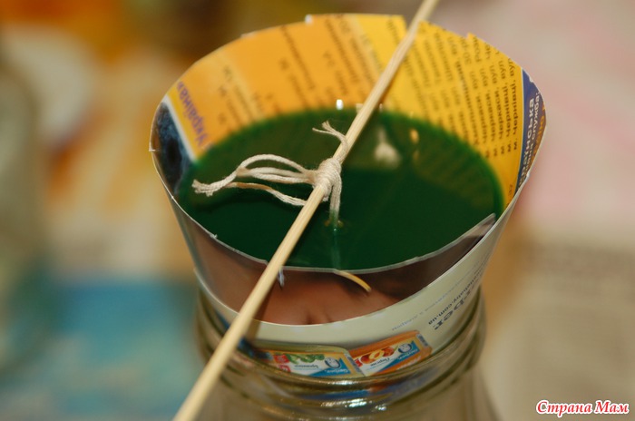 Пока смесь плавится, готовим форму. Для этого скручиваем кулечком журнальный лист и скрепляем его скотчем. Пропускаем через отверстие в конусе фитиль насквозь, закрепляем его узелком. Конус ставим в банку. На дно банки я положила кусочек фольги, чтобы вытекающий парафин не испортил банку. Выливаем парафиновую смесь в форму. Выливайте осторожно, так как на дне останутся кусочки фитилей, краска и блестки от свечей, которые мы переплавляли. Конец фитиля крепим к деревянной палочке. Оставляем до полного застывания при комнатной температуре.