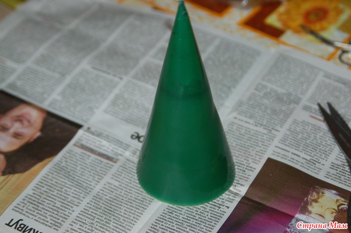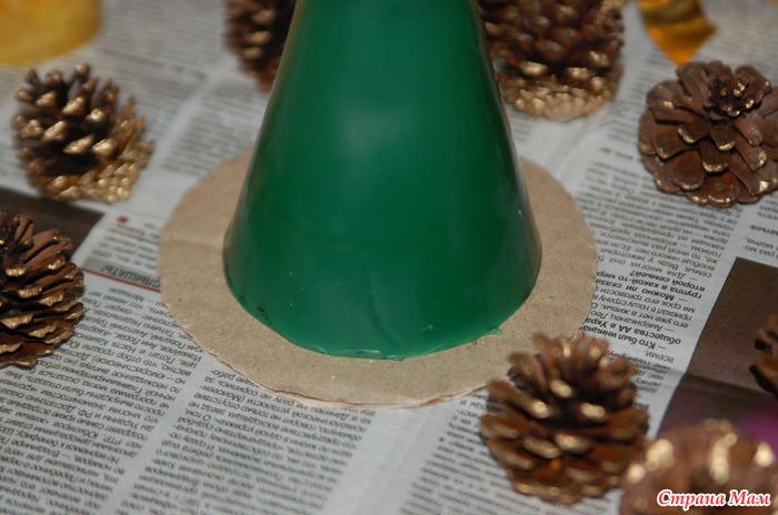 Приступаем к декорированию. Для начала необходимо сделать подложку из картона, вырезаем круг диаметром чуть больше, чем основание нашей ёлочки. Я оплавила дно ёлочки над огнем и поставила на подложку, таким образом она хорошо приклеилась.