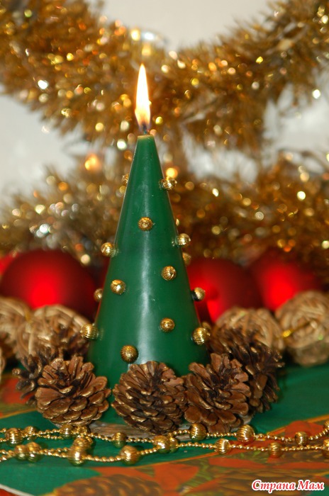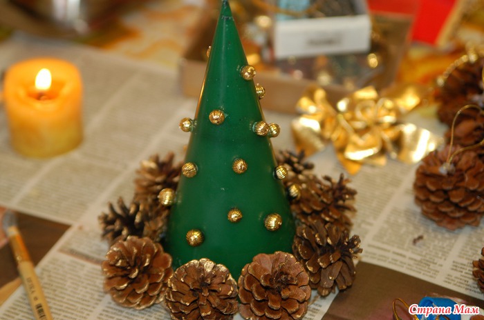 Затем по основанию крепим шишки. Я сначала пыталась просто посадить их на ПВА Номер не прошел. Тогда я взяла портновские булавки, в каждую шишку воткнула по булавке, затем подержав ее над пламенем свечи, добивалась раскаления и вставляла ее в свечу. Теперь шишки отлично держатся и никуда не денутся.