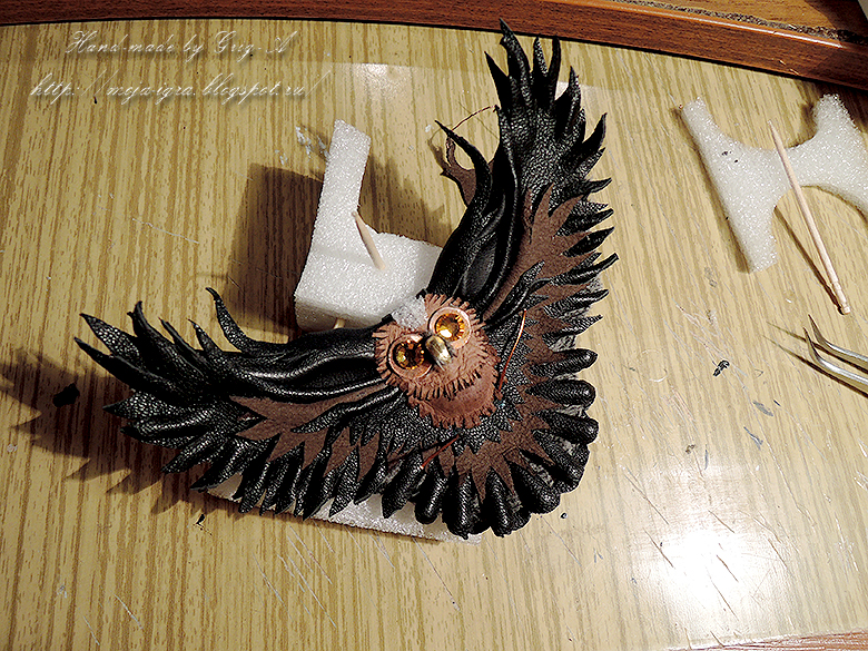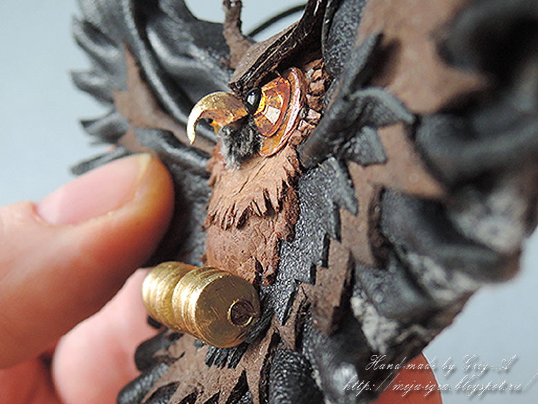 Перья подклеены на кусочки зубочисток для создания объема и рельефа. Для формы в коже проложена медная проволока. Подглазье сделано из среза медного прутка радиусом 10 мм; глаза - большие желтые стразы, зрачки - маленькие черные стразики. Из латунного прутка выпилены когти и клюв.