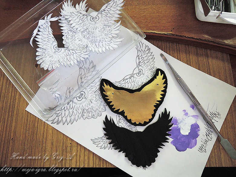 Теперь, как всегда, несколько фотографий процесса: сначала муж нарисовал филина, так сказать, сделал выкройку, затем по выкройке вырезал латунный лист 1,0 мм толщиной, который, как он говорит, отжёг... не знаю, что это такое, но лист стал податливым.
