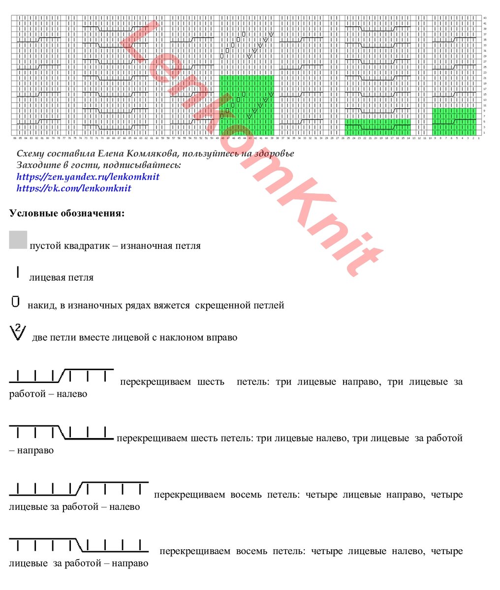 К платью я составила две схемы. Первая - косы в центральной части. Зеленым цветом выделен раппорт каждой косы. В центре схемы - ложная коса, а остальные - настоящие.