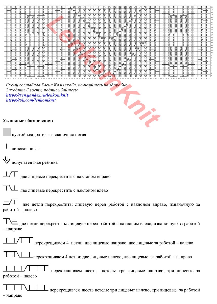 На рисунке - схема центральной части свитера и условные обозначения к ней (81 петля). Справа от этих петель сначала вяжем узор,который на петлях с 26 по 40. Затем - все петли со схемы. А в конце - повторяем узор, который на петлях с 42 по 56.
