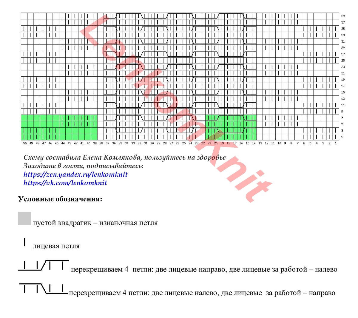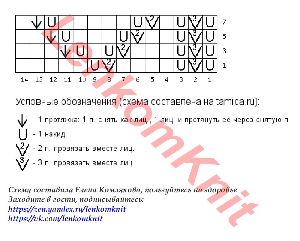 На рисунке - один раппорт узора (14 петель и 8 рядов). Там, где вяжутся вместе лицевой три петли, нужно, чтобы средняя находилась по центру сверху.