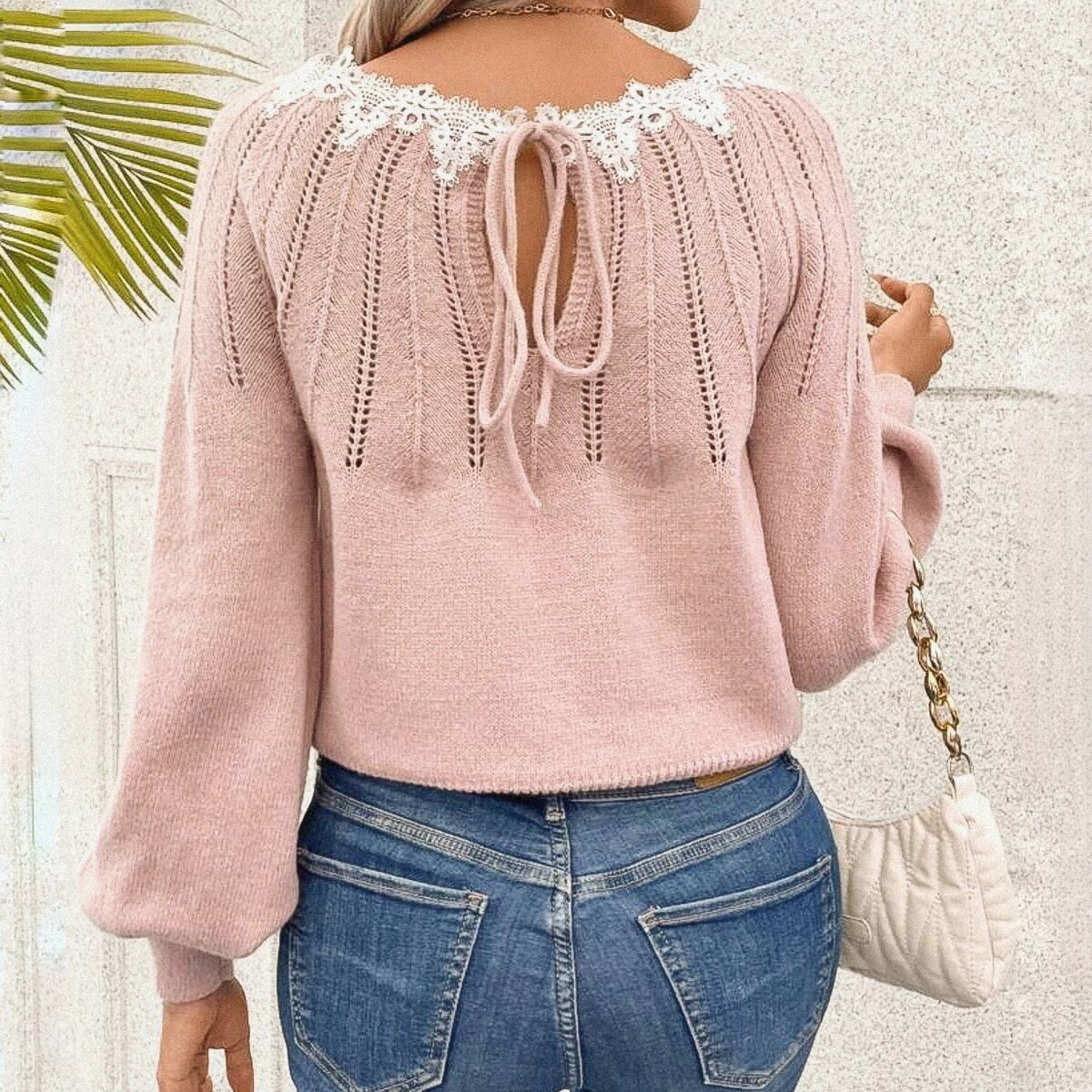 Симпатичный женственный и простой в исполнении джемпер на круглой кокетке, которая украшена элементарным ажурным мотивом и нежным кружевом пришитым вдоль выреза горловины.