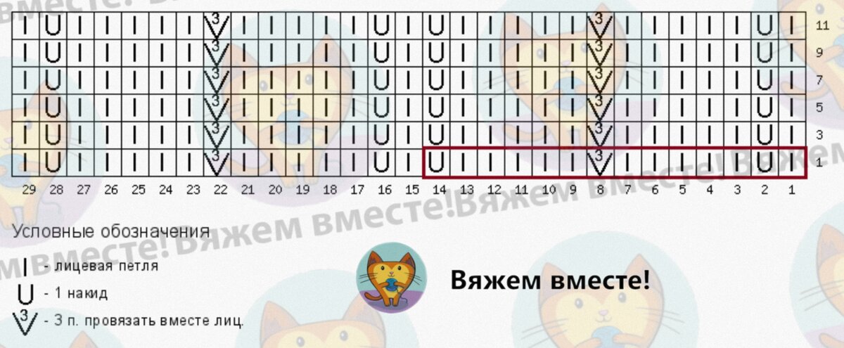 Раппорт узора равен двум рядам по высоте полотна, ширина раппорта варьируется в зависимости от высоты. Этот момент вы рассчитаете сами, а на схеме дан лишь принцип вязания.