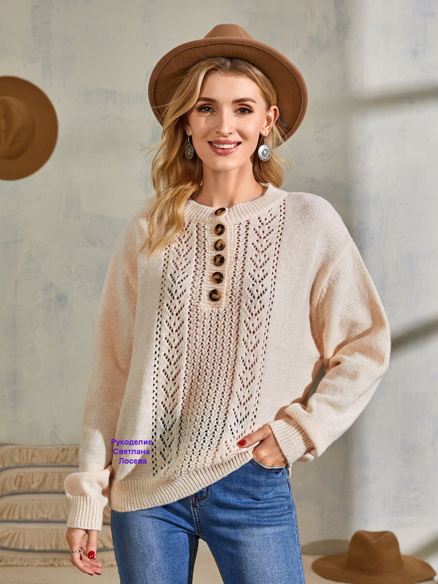 Дорогие мастерицы! Предлагаю вашему вниманию модный джемпер с мелким ажуром в центре в стиле "воротник поло". Да, воротника нет. Упрощенный вариант.
