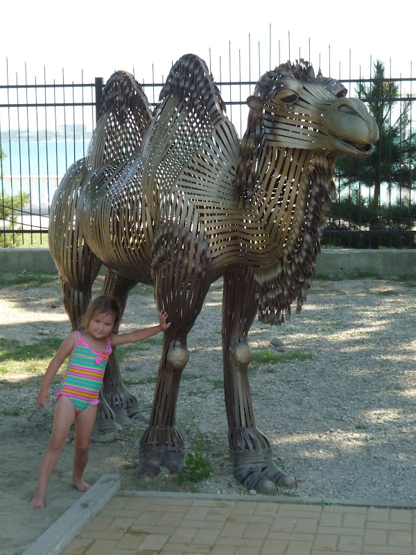 Это она меня упрашивает ее на верблюда посадить. Верблюд-металлист (из металла он).