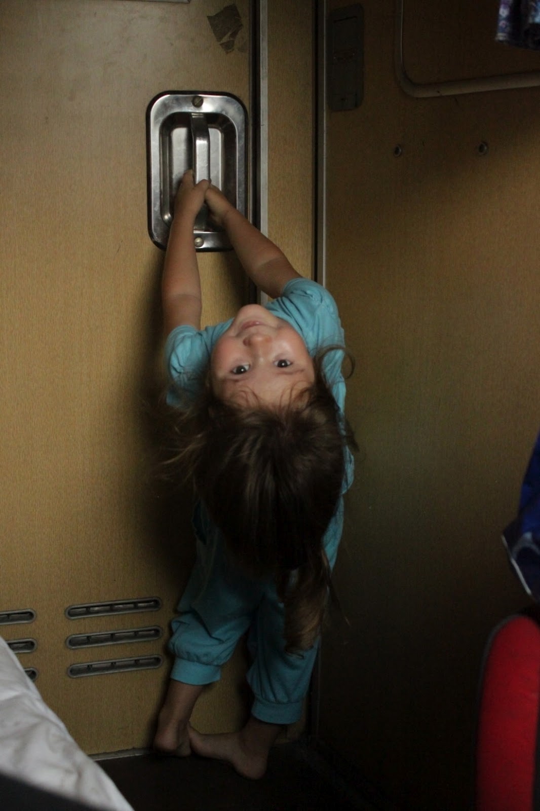 Подходит наш поезд. Выходит встречать нас проводница, девушка Аня. Страшненькая девушка Аня. Заходим в наш купейный вагон: Я, двое детей, два чемодана, две дамские сумки, автомобильное кресло и горшок. Уже не терпеться прилечь, как я понимаю, что номера мест у меня 37, 38, а последнее купе заканчивается номером 36. О-па-чки!!! В итоге выясняется, что это купе- проводников. Заходим, мы такие в этот домик из коробков и первая моя мысль: Тут будем ехать или мы, или наши вещи. Я понимаю, что мы там со всем своим пол царством помещаемся или стоя или лежа. Кое-как размещаемся, и я молю бога, чтоб моя обезьяна 3,5 лет, не нажала стоп кран, который так и манит ее своим красным цветом. Едем. Как и положено люди идут в купе проводников за чаем, за ответом, когда откроют туалет или с вопросом, сколько мы стоим на данной станции. Надо заметить, что некоторые заходили, раз попять по ошибке. В очередной раз распахивается дверь и высовывается мужчина со словами: А можно мне? Тут Есения меня просто вырубает. Поворачивается к этому мужику и так серьезно говорит: 50 рублей. Минут 5 я рыдала от смеха, а мужик просто вылетел пулей.