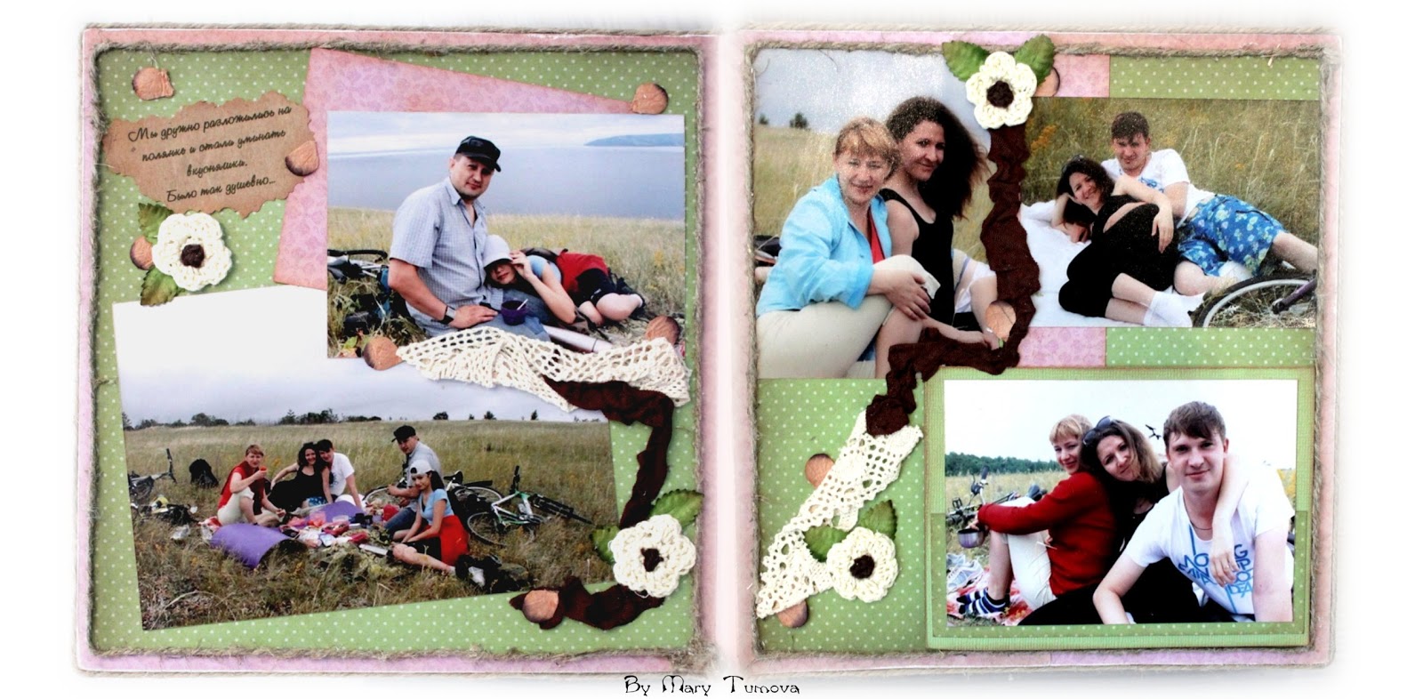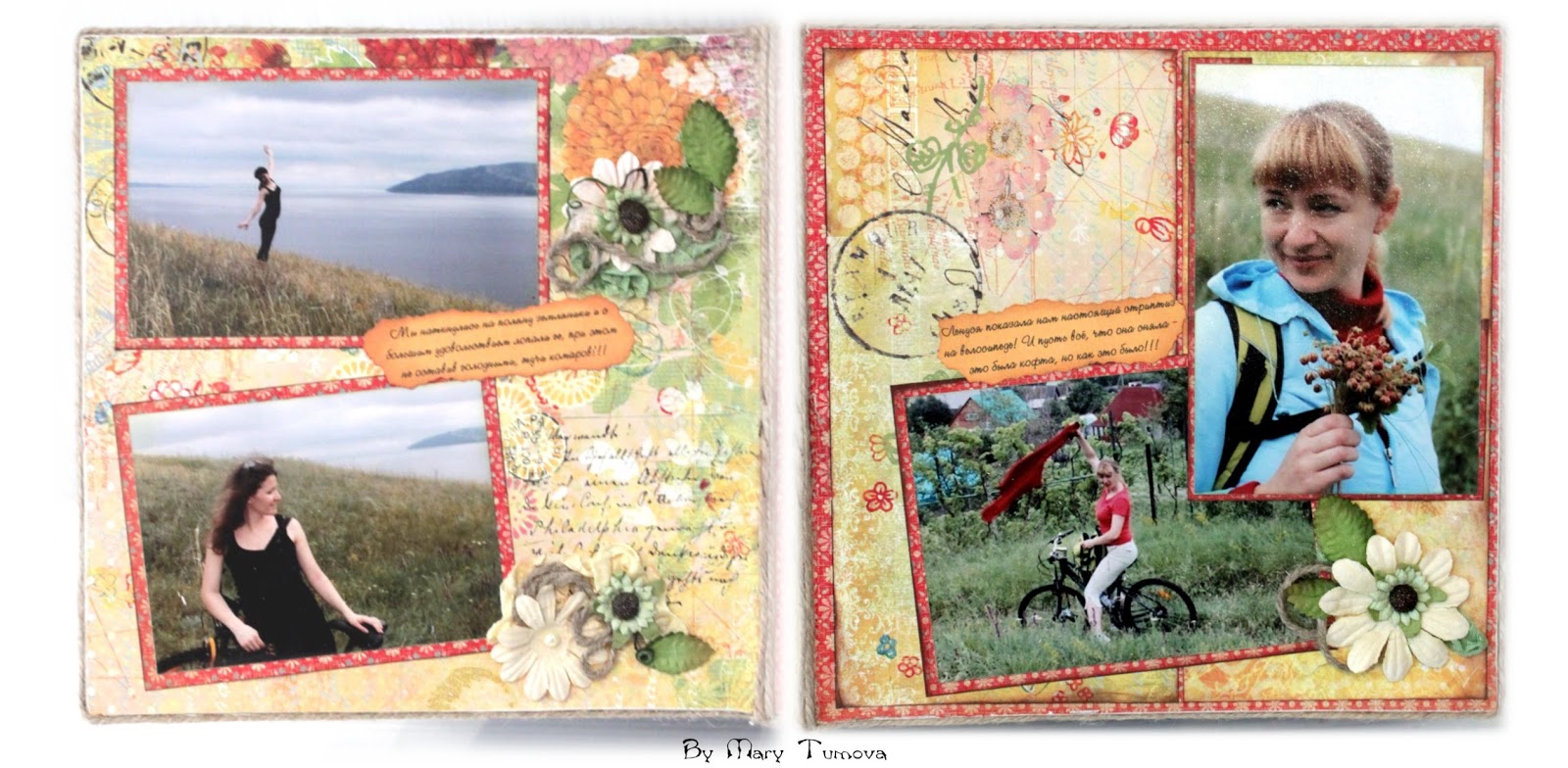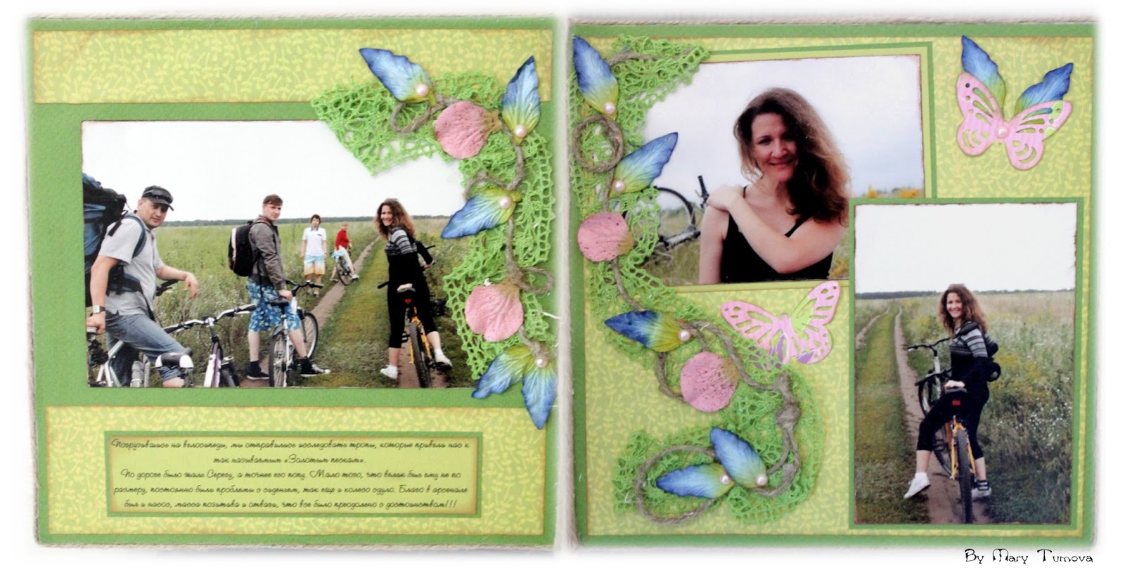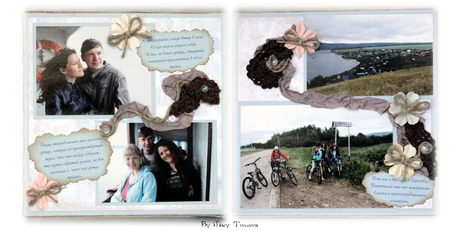 Наконец-то закончила альбом с нашей летней вело-прогулки. Он получился очень большим и толстым. Края я обработала шпагатом и вид получился довольно миленьким.