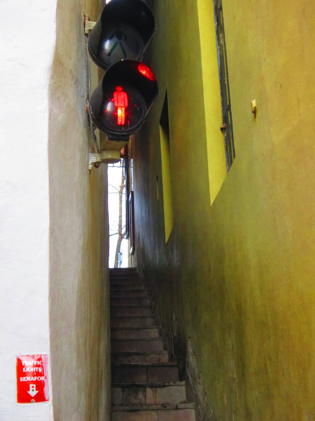 Это самая узкая улица в городе, которая ведет в кафе Чертовка. Светофор стоит для того, чтоб люди смогли разойтись, поскольку ширина улицы от 60 см до 1 метра 20 см.