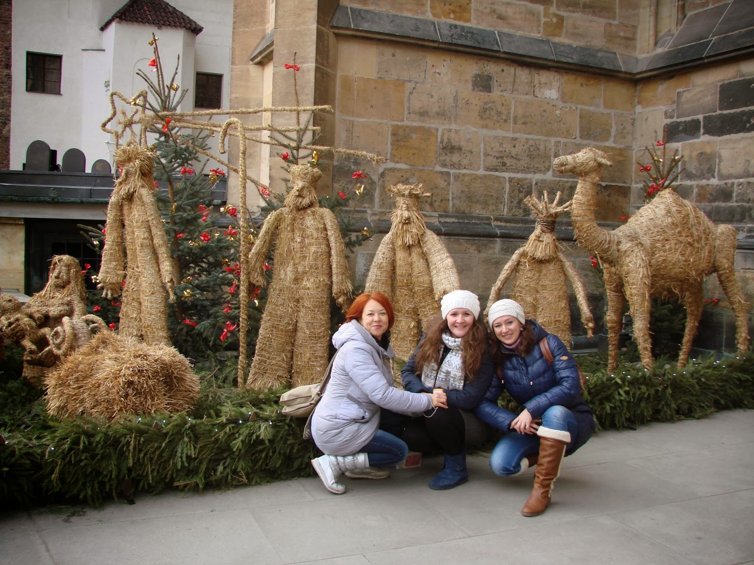 Мы с девочками на фоне скульптур из соломы.