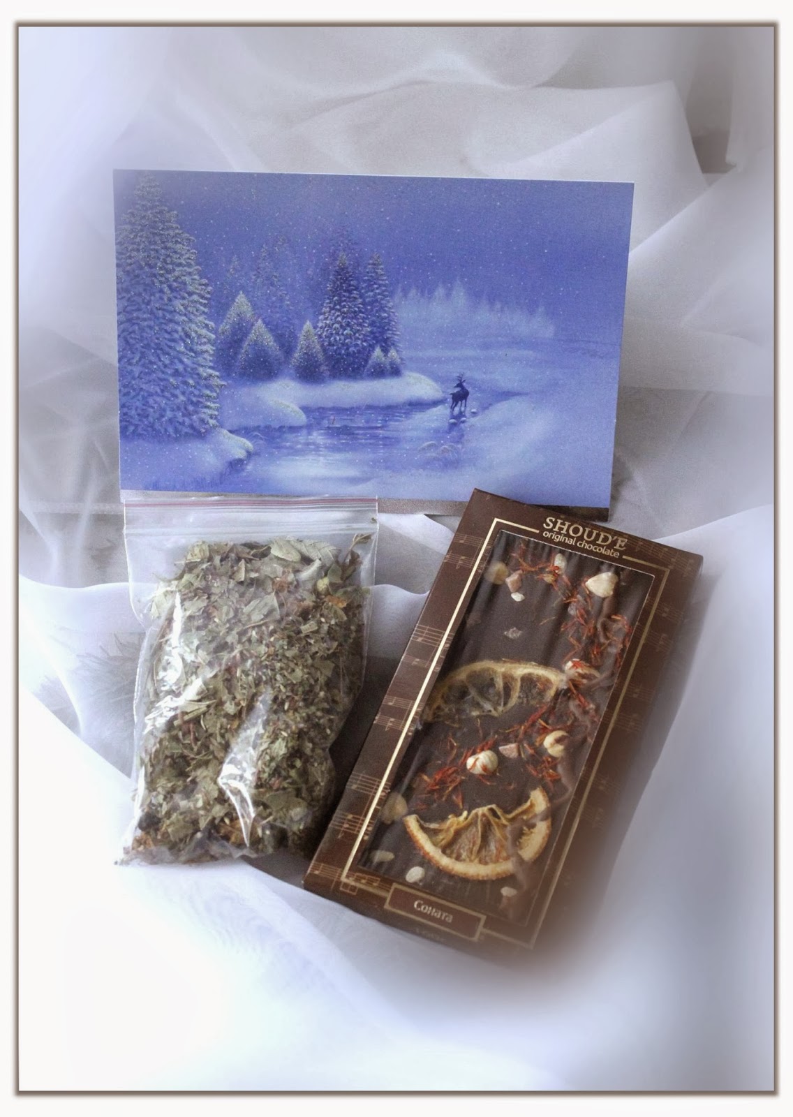 Красивишняя открытка с теплыми и трогательными словами, вкусный травяной чай, и обалденный шоколад.