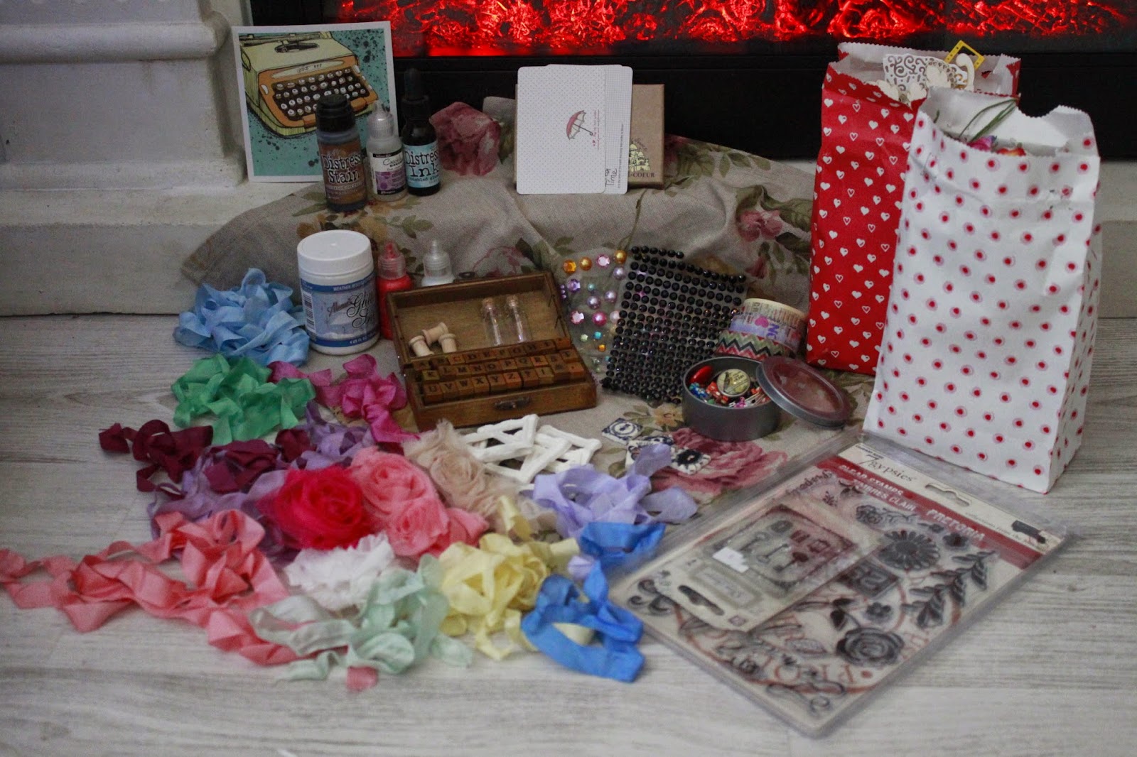 Там были такие мешочки. А в них были сокровища, один полон шебби-лет, второй всевозможных контуров и чернил, третий с цветами, а четвертый с чипбордами и бусинками... Это просто мега-круто. И я такой хомяк-хомяк!