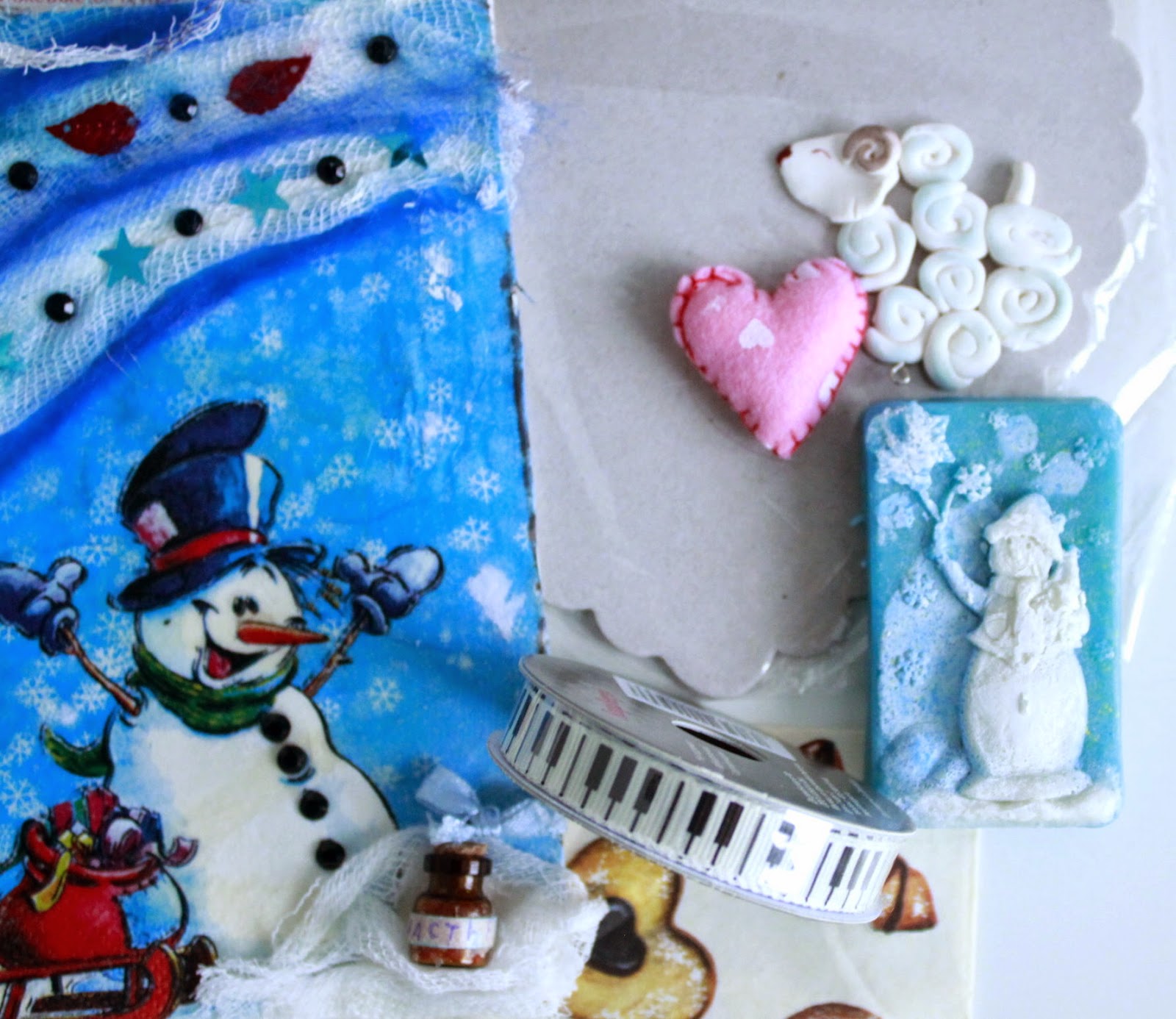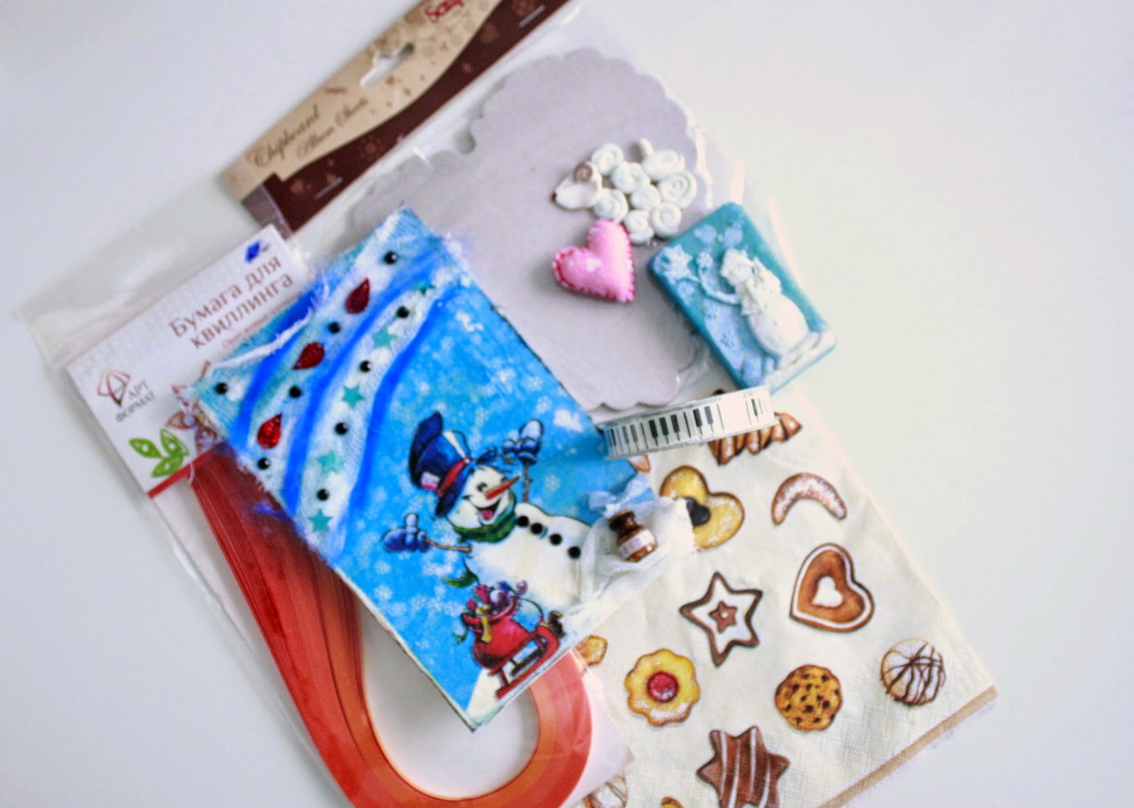 В ней были заготовки для квиллинга, декупажная открытка с кусочком счастья, заготовочка, салфеточка, очаровательный барашек (к сожалению он разобрался на части по дороге, но я решила его вставить на какую-нибудь скрап-страницу), тесьма нотки и оно.... прекрасное мыло со снеговиком. Оно просто восхитительно. Очень мягкое и душистое.