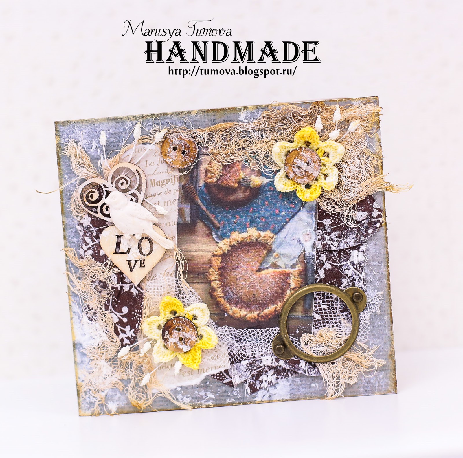 Здравствуйте, дорогие читатели! Какое же интересное задание мы для Вас подготовили в блоге ScrapMaster на этот раз! Сколько полетов фантазий, фактурности и интересных творческих решений мы ожидаем увидеть от Ваших работ. Ну а сегодня, лично я, Маруся Тумова, хочу с Вами поделиться моей тканевой открыточкой с вкусным осенним пирогом! Надеюсь, вы тоже любите вкусности в любое время года! И не забудьте про обязательные элементы: птичку и рамку.