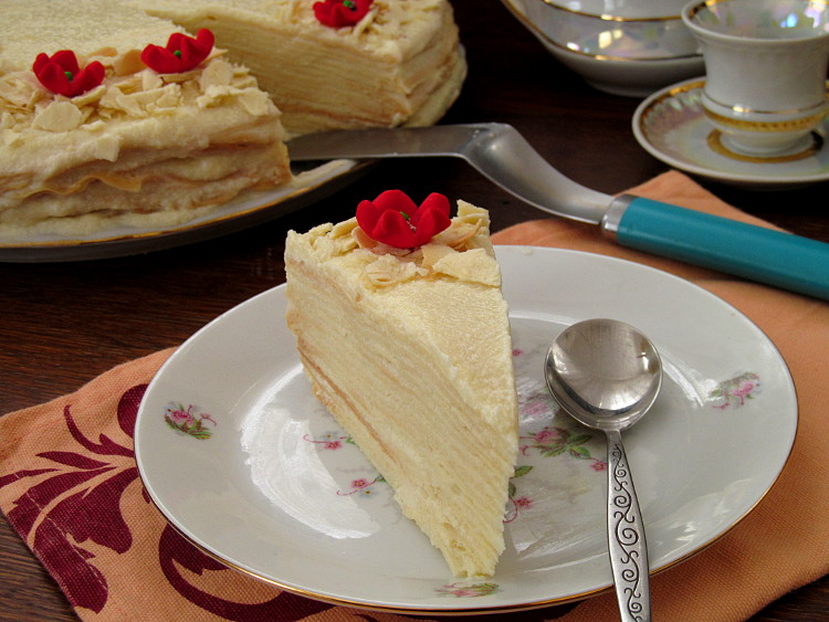 Хочу угостить вас неимоверно вкусным "Наполеоном" с пломбиром!!! Со всей серьезностью заявляю, что вкуснее "Наполеона" я еще не ела!!! И на фоне этого тортика для меня просто меркнут все остальные его аналоги))) Хрупкие и тонюсенькие коржи перемазаны изумительно вкусным кремом, в который добавляется пломбир... это сказка!!! Вкус у тортика настолько нежный, с приятным оттенком пломбира, а структура бархатная, и каждый кусочек просто тает во рту принося вам настоящее наслаждение!!! Единственное, что хочу отметить, это то, что в рецепте количество крема указано так сказать впритык))) Поэтому, для любителей влажных тортов, где много крема, автор рецепта (да и я тоже) рекомендует увеличить норму крема в два раза. Либо уменьшить норму теста в два раза, и сделать небольшой тортик меньшего диаметра. Я делала полторы порции крема, на полную порцию теста, и скажу честно немного пожалела, что не сделала двойную порцию крема))) В следующий раз обязательно будет двойная порция крема, и только так! Уж больно я люблю тортики где много крема))) Но вы конечно ориентируйтесь на свой вкус... И хоть приготовление, а точнее раскатка коржей занимает много времени и сил, но оно того все-же стоит! Рекомендую попробовать!!! Кстати, на вторые сутки тортик становится только вкуснее. И, перед подачей я рекомендую достать тортик из холодильника и подержать немного при комнатной температуре, тогда вы сполна и отчетливее сможете оценить его вкус! Угощайтесь!!!